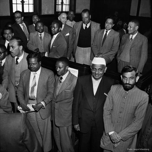 20 Defiance Campaign Leaders appear in the Johannesburg Magistrates Court on a charge of contravening the Suppession of Communism Act. In the image we see 14 of the 20 leaders on trial.