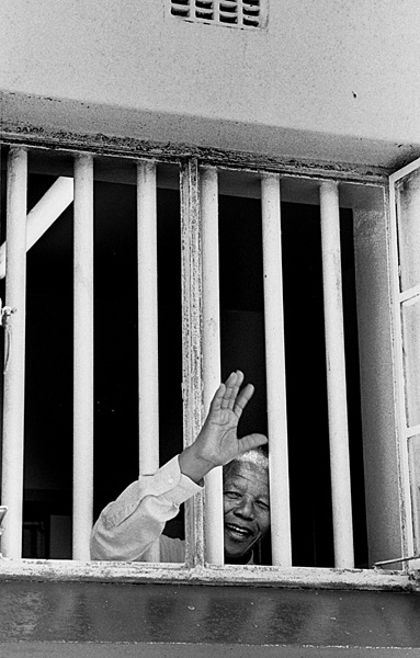 South African president Nelson Mandela revisits his prison cell on Robben Island, where he spent eighteen of his twenty-seven years in prison.