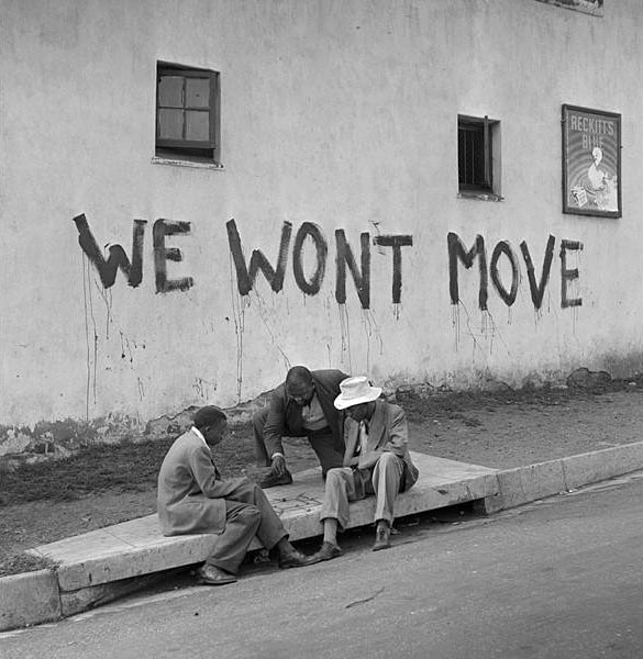 The apartheid government in 1954 was determined to demolish Sophiatown, the multiracial suburb of Johannesburg. The ANC, encouraged by Mandela, campaigned vigorously to resist saying 'We Won't Move!". When the police arrived that first day, people banged and tapped with stones and iron bars against the lamp-posts and Sophiatown echoed in defiance.