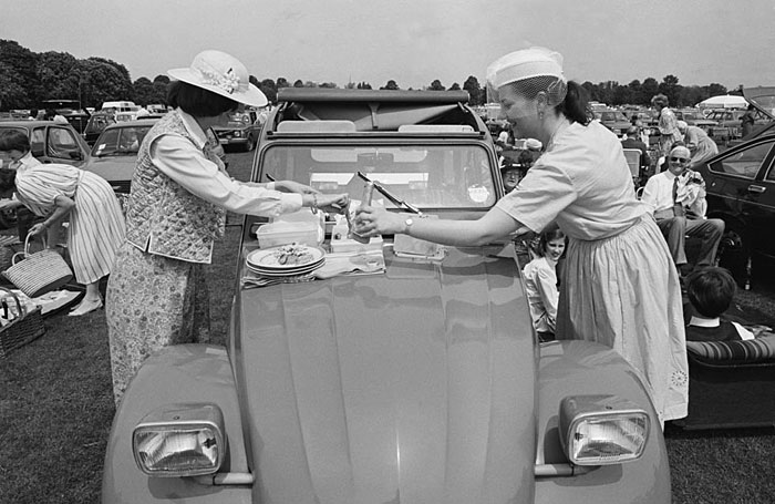 A picnic on the bonnet of a car during the Eton College Open Day, UK, 4th June 1983. Information or Purchase Request