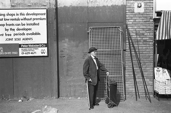 A London pensioner visits the shops with his wheeled shopping trolley. Information or Purchase Request