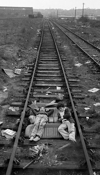 Two boys build a bonfire on a disused section of a railway line at London Docks. Information or Purchase Request