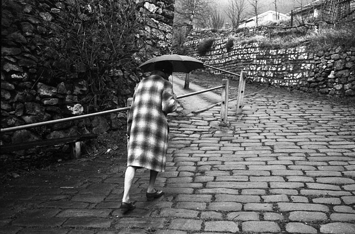 A woman makes her way up a cobbled street in Nottingham on a rainy day. Information or Purchase Request