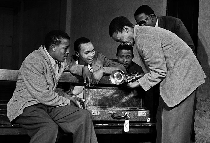 The young Hugh Masekela receives the trumpet from Satchmo, a gift organised by Father Trevor Huddleson, an avid supporter of African jazz and founder of the Huddleson Jazz Band