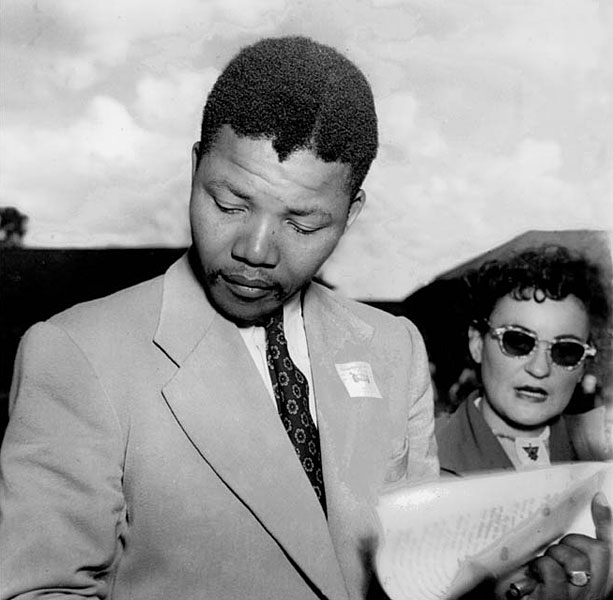 Nelson Mandela and activist Ruth First (1925 - 1982) at the ANC Conference in Bloemfontein where the Defiance Campaign was conceived and planned. Mandela is wearing an ANC badge. Information or Purchase Request