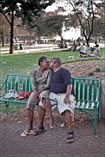 A couple share a kiss in Joubert Park, Johannesburg.