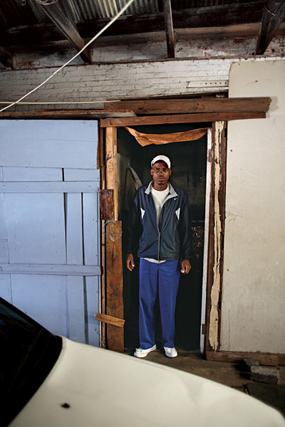 Siyanda Chamana at home in Johannesburg. He has lived in a shack in a garage used for car repairs for four years. He earns R600 a month as a casual worker on a building site. Information or Purchase Request