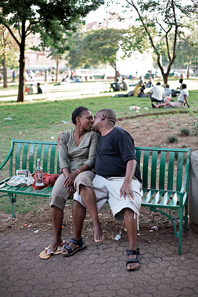 A couple share a kiss in Joubert Park, Johannesburg.