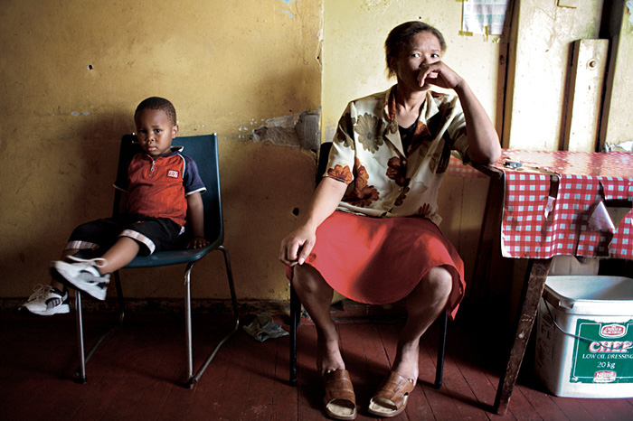 Thoko Madondo (37), and her son Siphosihle (3), at Ginwell House Johannesburg where she has lived for three years. She is unemployed and doesn't receive child support. Her boyfriend supports her by buying and selling scrap. Information or Purchase Request
