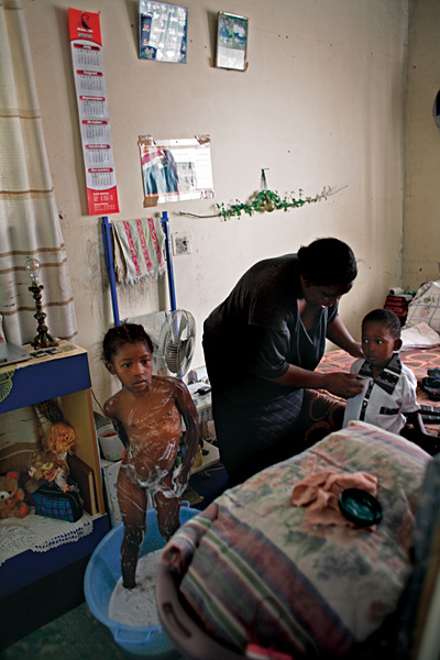 Nombeko Mboya with her two children Sisonke (5) and Uluthando (4) in Johannesburg. Nombeko is unemployed and her husband earns R1,900 per month before deductions. They cannot afford to send their children to a creche. They have lived at 23 Hunter Street for five years.