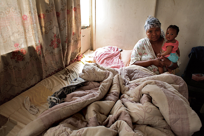Samkukensiwe Zondi and her six-month-old baby Mphile at home in the San Jose apartment block, Johannesburg. Samkukensiwe is unemployed and depends on her child's grant, which she supplements by selling pillows in the city centre, earning R300 a month. She has been living in San Jose for one year after being evicted from another derelict building.